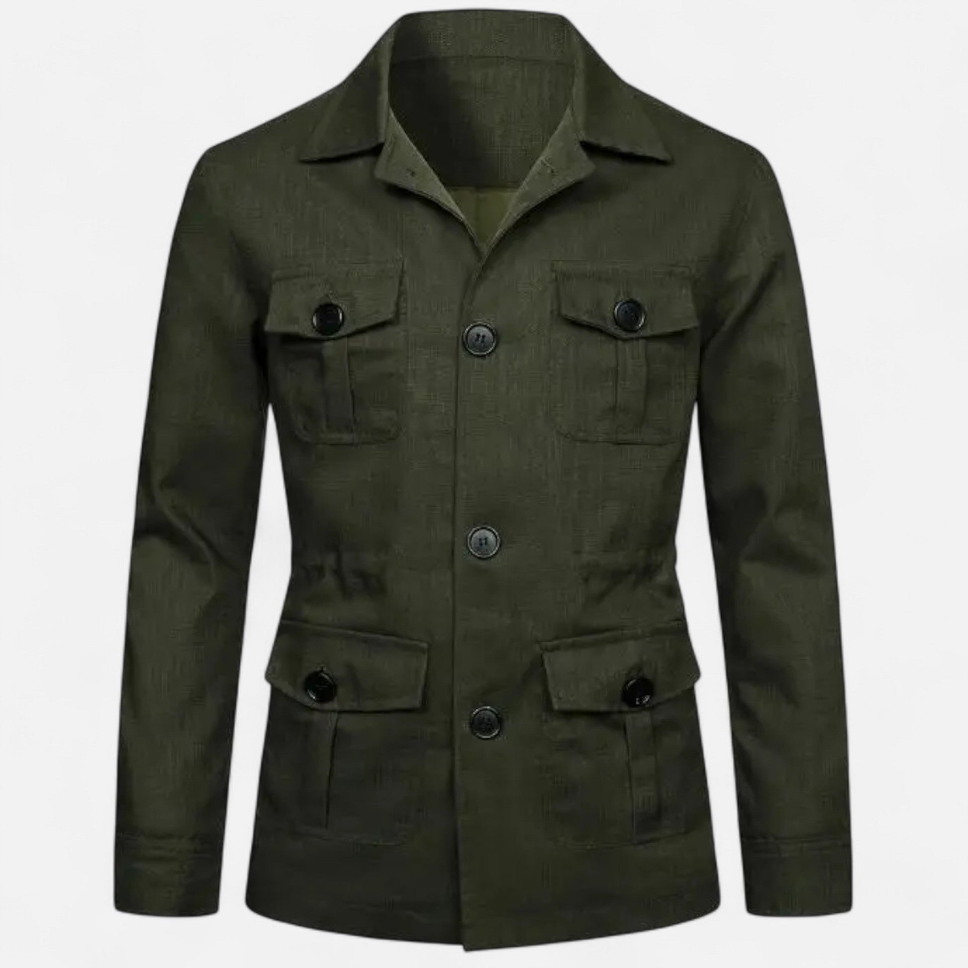 Crafted from a premium cotton-blend fabric, this jacket features multiple flap pockets, a structured collar, and a front zip closure for a clean, utilitarian look. Its midweight design provides warmth while maintaining breathability for transitional weather.
