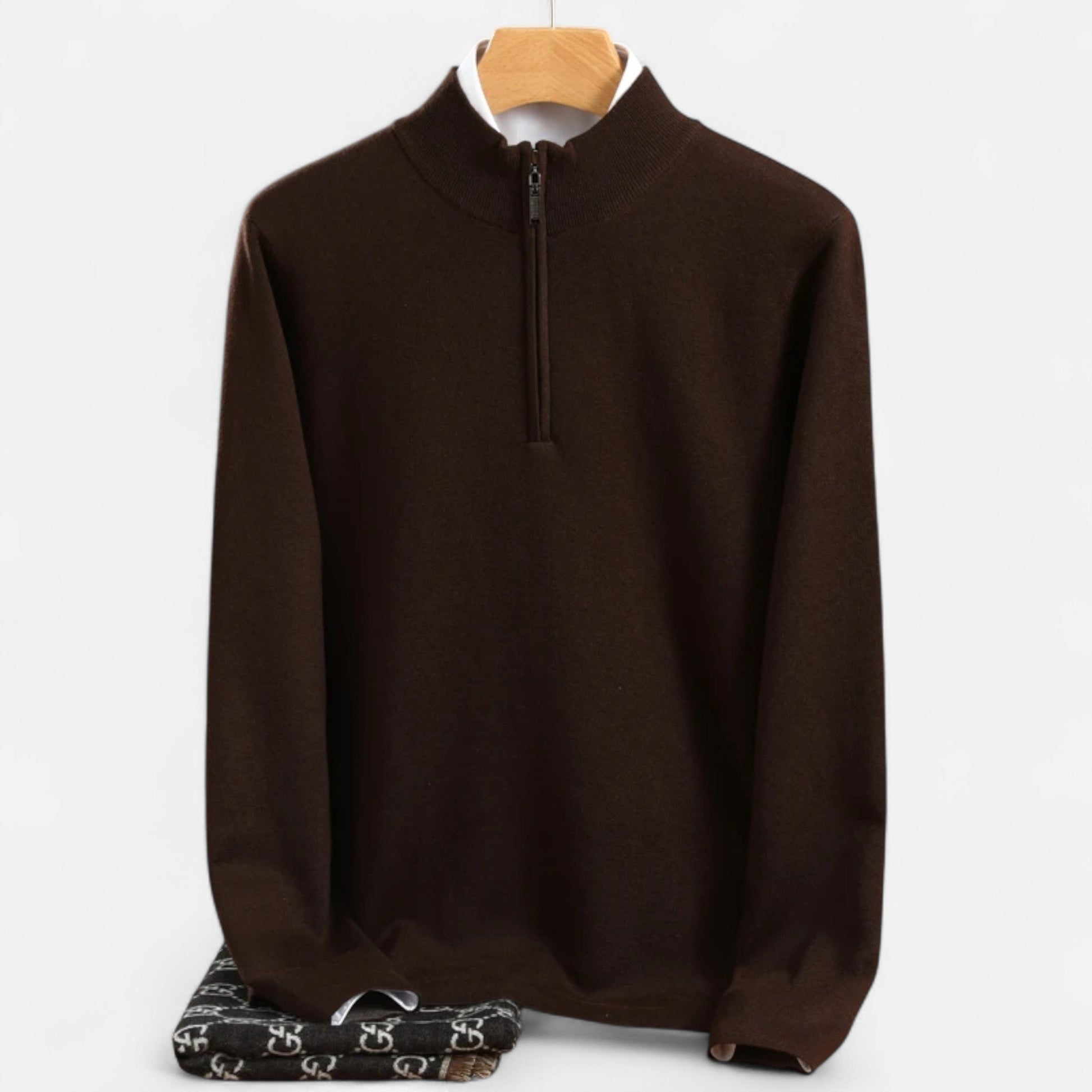The premium merino wool knit offers exceptional softness and breathability while retaining warmth for the cooler months. The discreet half-zip closure allows for adjustable styling — wear fully zipped for a polished look or slightly open for a more relaxed feel.