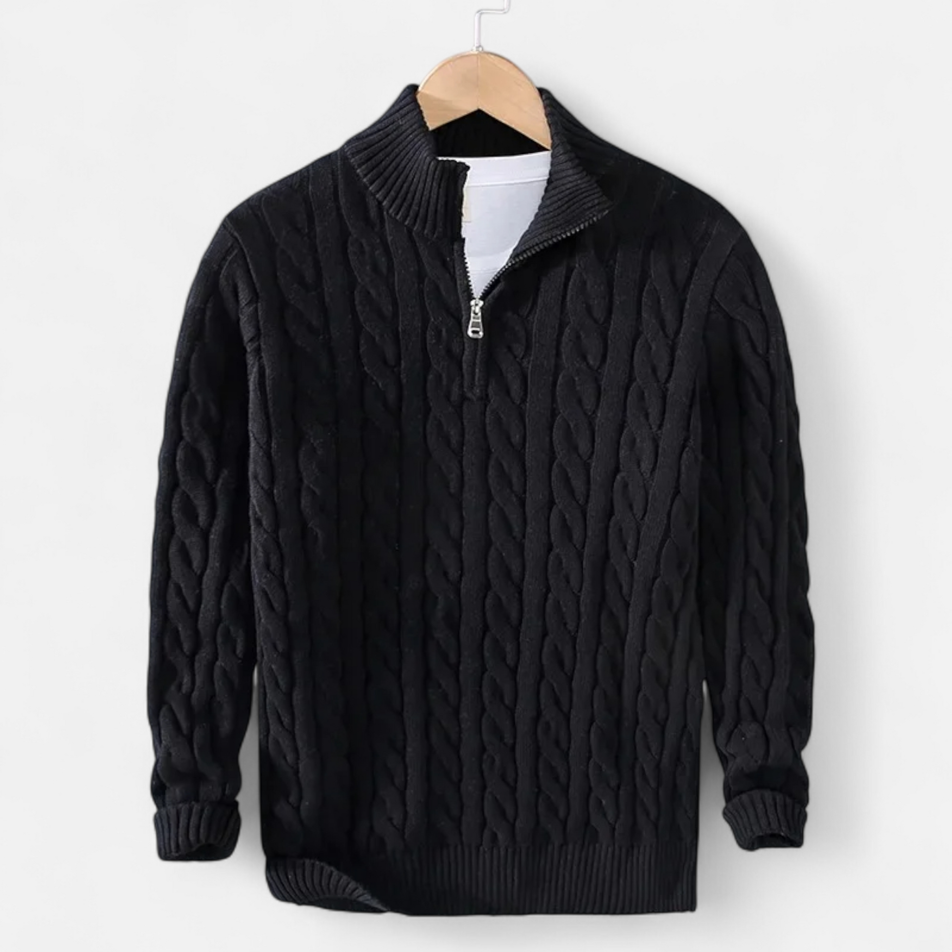The dense, rough-needle knit provides superior insulation, ensuring warmth in cooler months without sacrificing breathability. The half-zip closure allows for adaptable styling, whether worn fully fastened for polished structure or slightly open for relaxed elegance.
